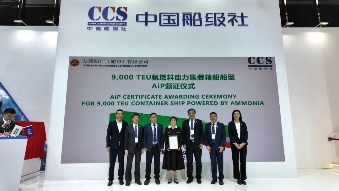 上海规范研究所所长朱坚向招商工业集团友联船厂(蛇口)有限公司颁发了9000TEU氨燃料动力集装箱船型AIP证书。友联船厂(蛇口)有限公司联合CCS,针对航运业低碳转型需求,共同开展大型装箱船氨燃料动力改装方案研究,开发了9000TEU氨燃料动力集装箱船船型。