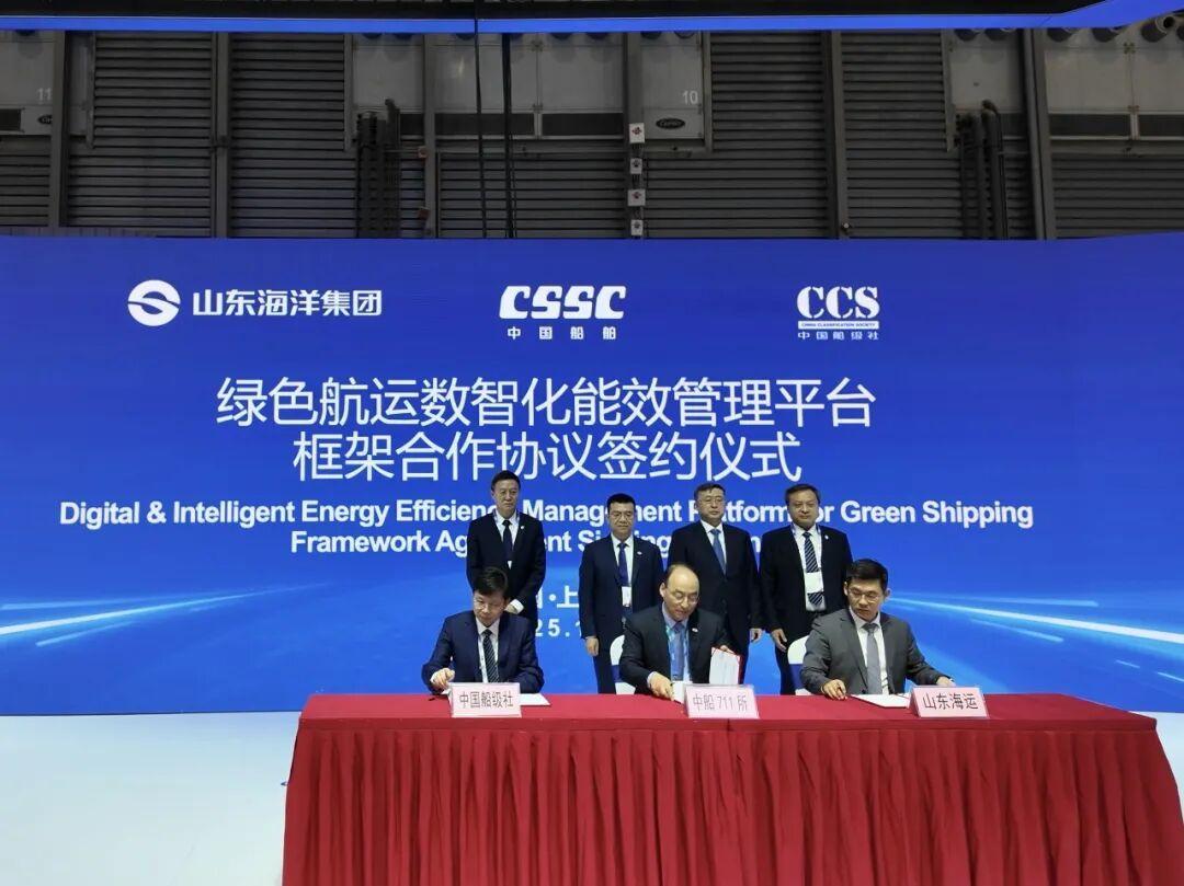 在中国船舶集团有限公司副总经理彭原璞、山东海洋集团党委书记、董事长姜国栋、CCS总裁赵晏的见证下,由中船集团711研究所所长王锋、山东海洋集团党委委员、副总经理/山东海运股份有限公司党委书记、董事长高长峰及CCS青岛分社总经理于怀明共同签署了《绿色航运数智化能效管理平台框架合作协议》,三方将发挥各自优势,联合研发建设绿色航运数智化能效管理平台并开展示范应用,推进大型船队运营“智能化、绿色化、融合化”发展。