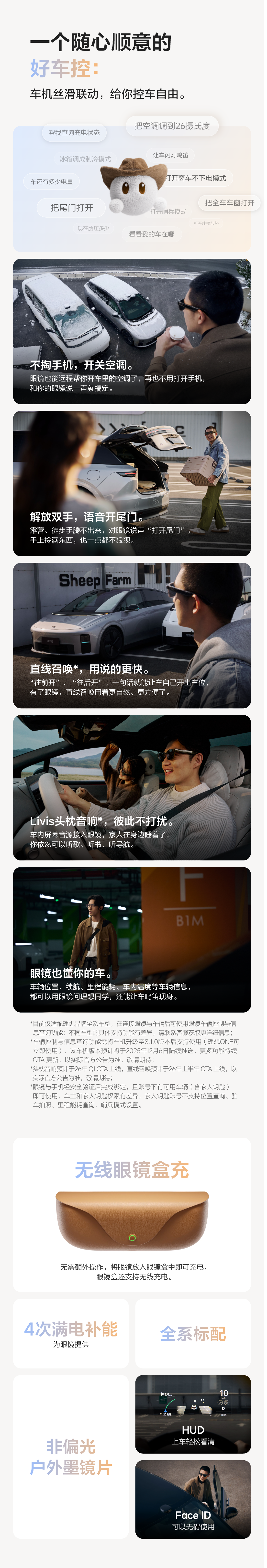理想AI眼镜 Livis是理想汽车体验的自然延伸。驾驶时佩戴墨镜款,用户能清晰查看HUD信息,并顺畅使用Face ID。通过“理想同学”语音指令,无需操作手机,一句话即可完成空调开启、方向盘加热、尾门控制等操作,覆盖日常用车的各类场景,带来更直接、更便捷的使用体验。