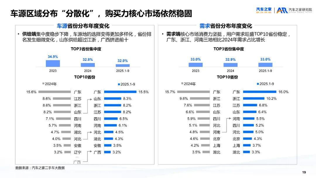 - 车源区域分布逐渐分散,TOP3省份集中度下降,低线城市车源贡献提升。