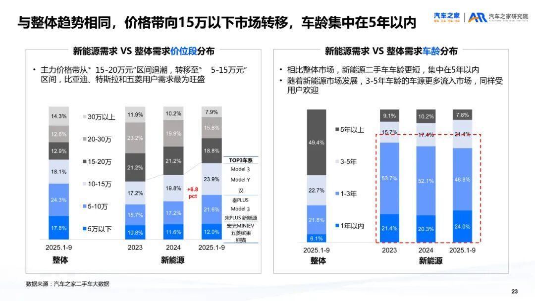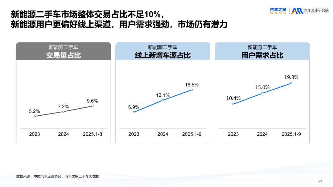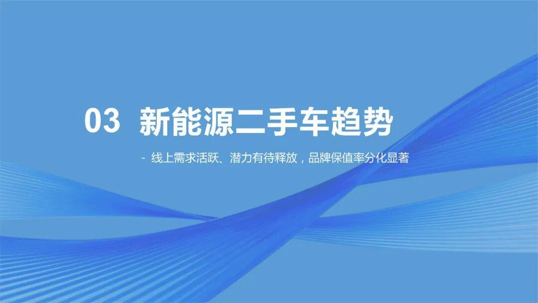 ●市场具备释放潜力:新能源二手车交易占比(9.6%)远低于新能源线上车源及需求占比(车源16.5%/需求19.3%),表明新能源二手车市场仍然具备较大释放潜力。