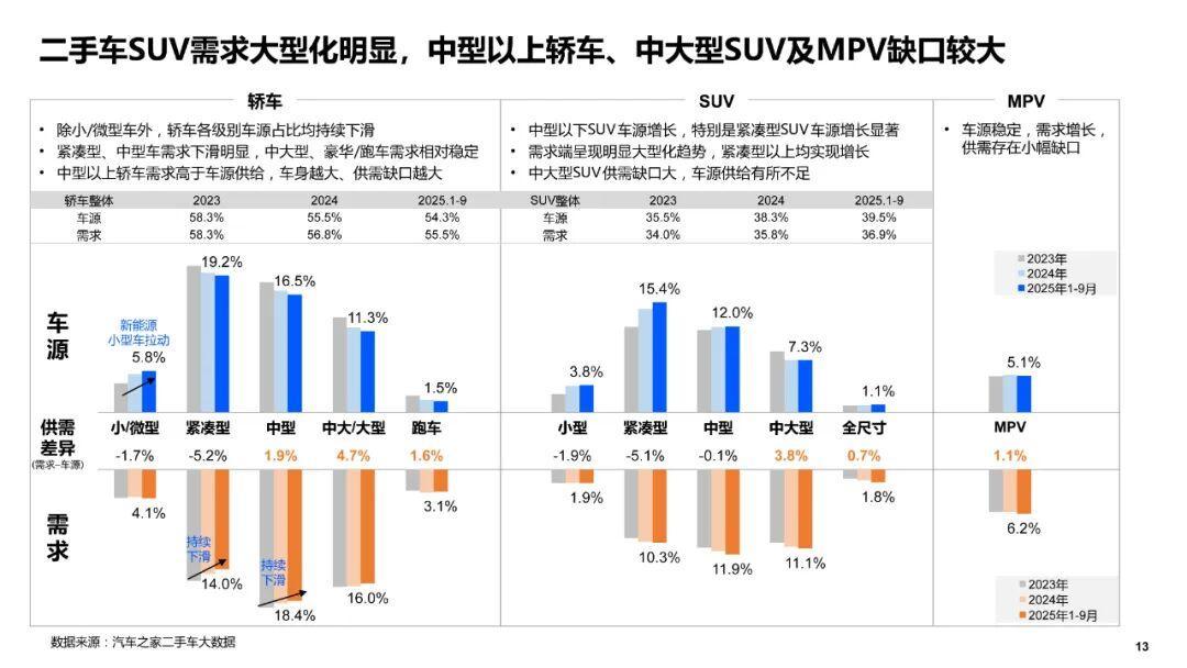 - 车身形式:供需缺口大型化明显,中型以上轿车、中大型SUV及MPV缺口较大。