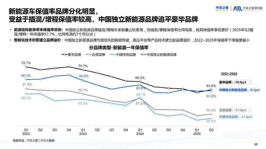●品牌保值率分化:中国独立新能源品牌一年保值率已追平豪华品牌,在各类品牌中降幅最小。