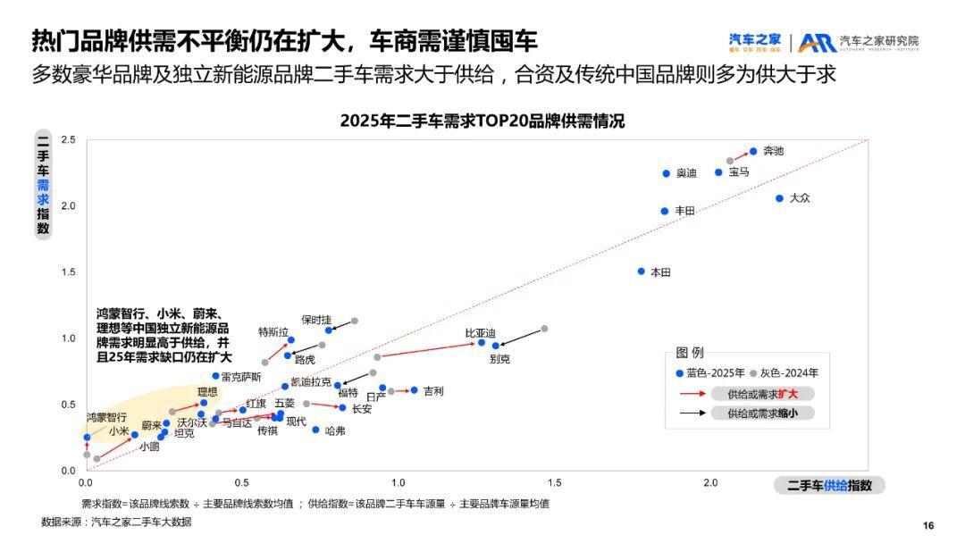- 品牌:豪华品牌和中国独立新能源品牌均出现需求缺口,尤其鸿蒙智行、小米、蔚来、理想需求明显高于供给,并且2025年需求缺口仍在扩大。
