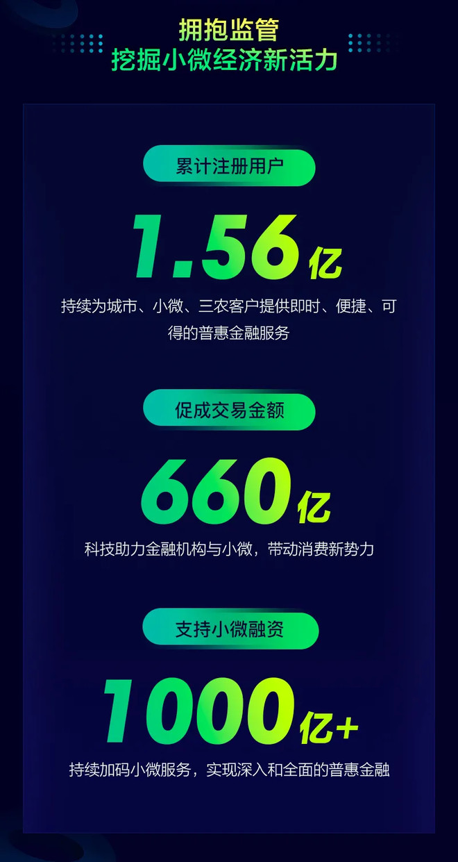 吴海生表示:“发展数据驱动、技术赋能的数字科技平台是我们长期秉持的战略,我们在科技助力金融机构、科技助力小微企业、科技助力用户消费等方面已经取得了阶段性成果。未来,我们将继续加大科技投入,拥抱技术变革,重塑金融服务模式,实现更加深入和全面的普惠金融。”