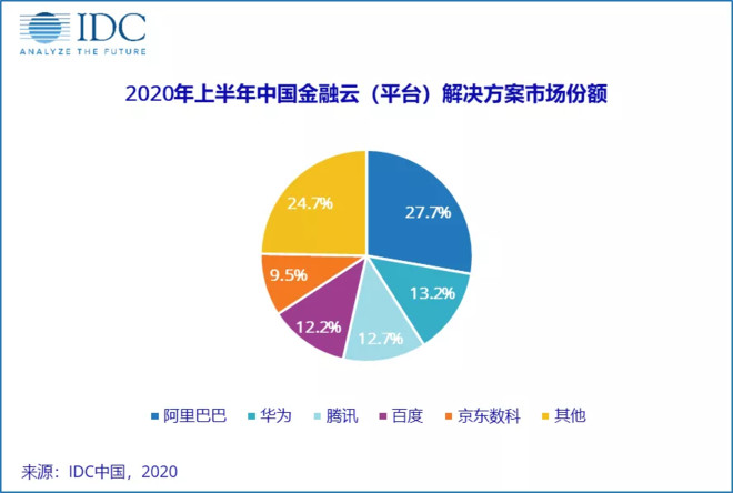 国际数据公司(IDC)最新发布的《中国金融云市场(2020上半年)跟踪》报告显示,尽管受到疫情影响,金融云市场在本周期内依然维持了良好的增长,同比增长37.5%。京东数科T1金融云也进入金融云平台解决方案市场前五名,在中国金融云(平台)解决方案市场上占据了9.5%的市场份额。