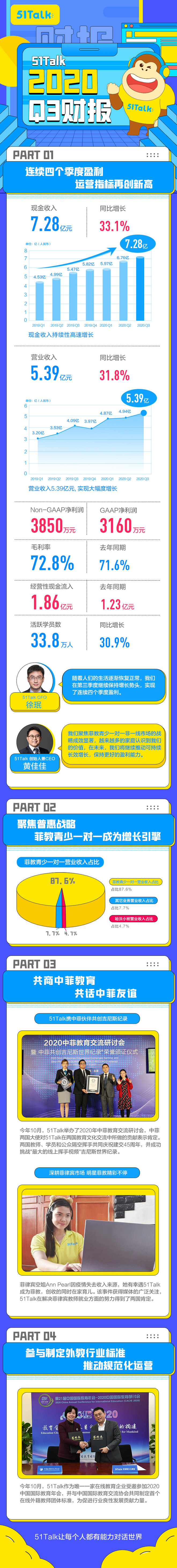 自2018年确立聚焦菲教青少一对一战略,深耕下沉之路,到2019年提出要做首家全国性普惠教育品牌,经过两年的不懈努力,51Talk财报数据从现金流为正,到菲教青少一对一业务实现盈利,再到此次连续四次盈利,这一系列成绩不仅印证了普惠战略和聚焦青少一对一战略的决策正确性,也为行业中健康发展树立了典范。