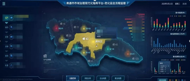 但是现在,通过政府侧的体制机制改革和京东数科的技术支持,南通市危化品全流程监管系统正在对南通市4000余家危化品企业的生产、使用、经营、运输、存储、废弃物处置进行全程跟踪预警,打通了城市应急管理局、交运局、公安局、市场监督局、行政审批局、生态环境局、海事局、消防等9个部门的12个业务系统,可以为市域管理者的精准施政提供科学的决策支持。