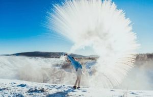 在零下50℃的冰天雪地中,体验“泼水成冰”。图片来自携程旅拍签约旅行家@橙小橙橙走天涯
