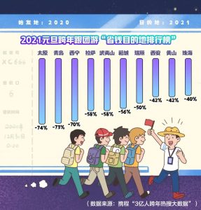元旦跨年省钱目的地为:太原、青岛、西宁、拉萨、武夷山、稻城、瑞丽、西安、黄山和珠海。据山西政府政策显示,山西省国有A级景区工作日期间对全国游客免首道门票。太原以74%的消费降幅,位列“省钱榜”首位。