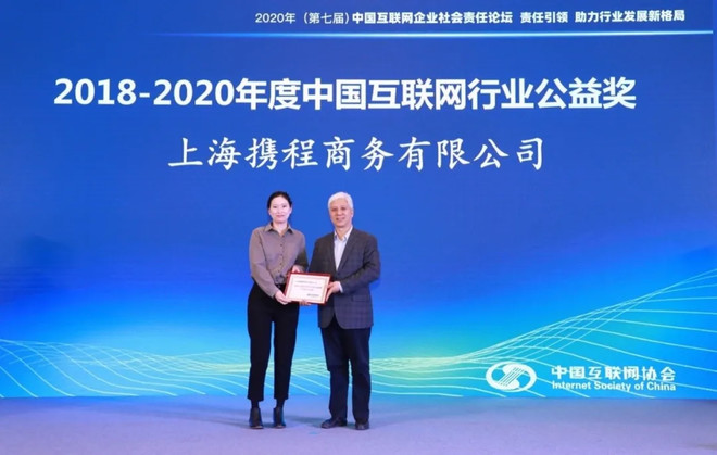 12月17日下午,中国互联网协会为携程集团颁发2018-2020年度中国互联网公益奖,以表彰其在互联网自律和公益工作中做出的突出贡献。