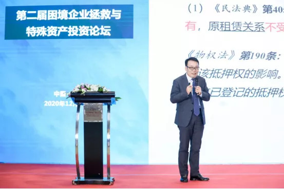 上海交通大学法学院民商法研究所所长、上海市法学会破产法研究会会长韩长印教授,作了题为“民法典语境下不良资产投资的风险回应”的主题演讲。韩教授从《民法典》若干具体法律条文出发,分析了民法典对我们困境企业投资可能产生的影响,包括不动产上权利负担的立法变化、不动产上权利负担的立法变化、动产上权利负担的立法变化、保证责任的立法变化、新设担保物权受偿顺位的复杂化、对格式条款内容控制力的力度提升等五个方面做了详尽细致的分析阐释,具有重要的实务指导意义。