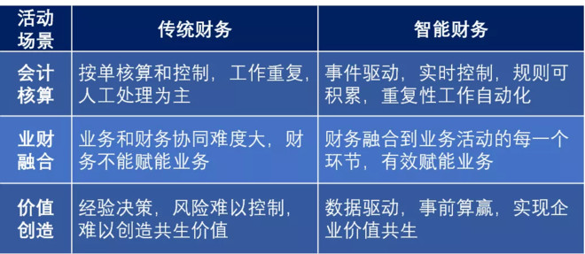 归纳起来,智能财务和传统财务表现的主要区别如下: