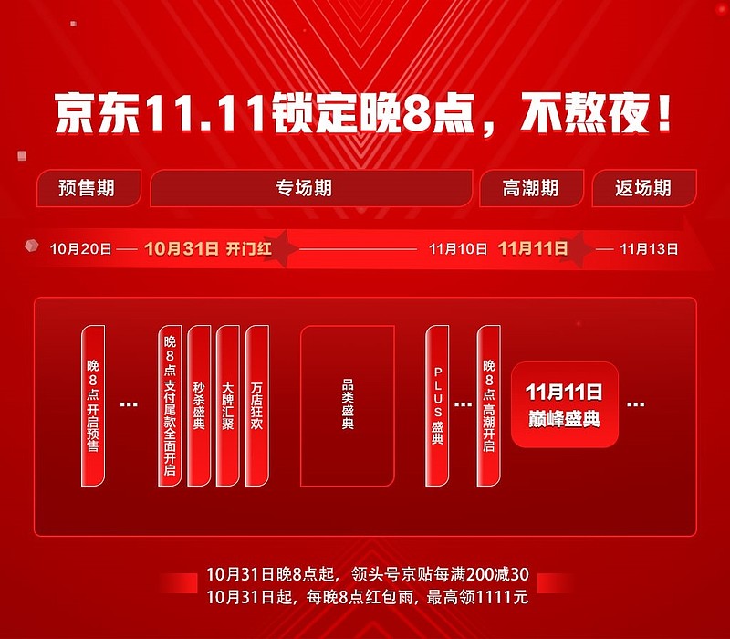 从10月31日晚8点起,消费者每天均可领取“每满200减30”的头号京贴,享受全品类跨店满减,同时头号京贴也可以在支付尾款时与定金膨胀优惠叠加使用。10月31日晚8点至11月11日期间,每晚8点京东APP会下起现金红包雨,最高可领1111元!