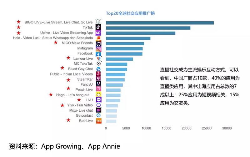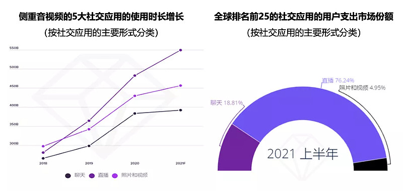 何维介绍,当前音视频应用使用时长、收入占比持续攀升。在 2021年上半年排名前25位的社交应用中,以直播为突出功能的应用占据四分之三的用户支出,音视频应用逐渐成为用户支出大户。此外,纵观全球社交应用推广榜Top20,音视频产品占65%,基本所有社交产品都融入了音视频功能。