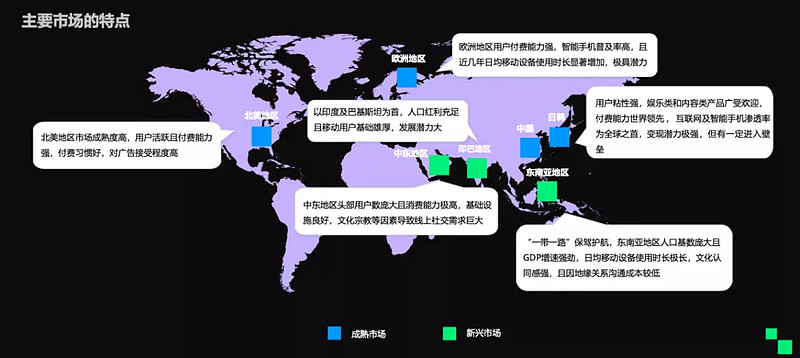 当前全球互联网社交主要分为以欧洲、北美、日韩为代表的发达市场,以及以中东、印巴、东南亚为代表的新兴市场。众多互联网出海企业选择以新兴市场为全球化起点。