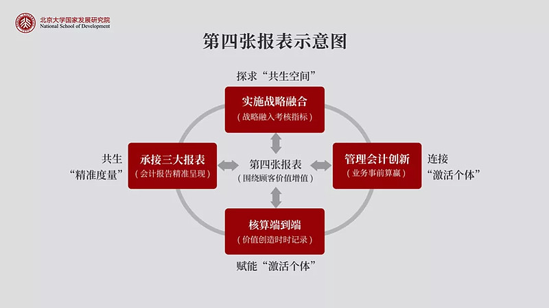 现在,非常多的企业在数字技术之下就多了一张报表,不同的人给它不同的定义,我们把它统称为“第四张报表”。“第四张报表”其实是围绕着顾客价值去做增值。如何在战略当中拓展更大的共生空间?如何从财务会计本身去理解每个个体的价值贡献?如何在财务原有三大报表当中精准的度量每一个价值贡献?